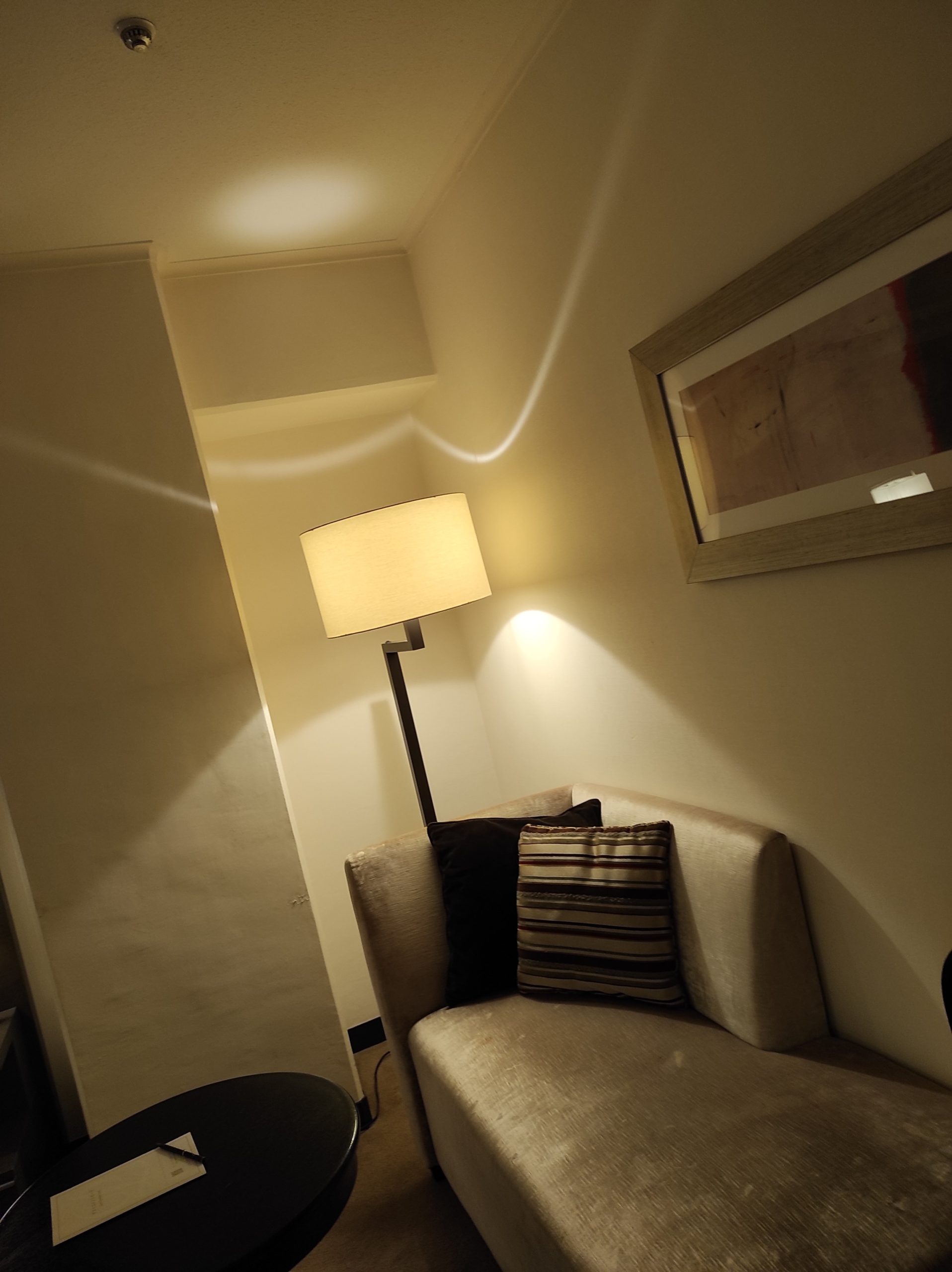 部屋自体の印象は、ロマンチックな感じ。というのも、照明をMaxでつけても暗いからです。カーテンの遮光性も高く、お昼間でもカーテンを締めていたら、昼か夜かわからない感じ。